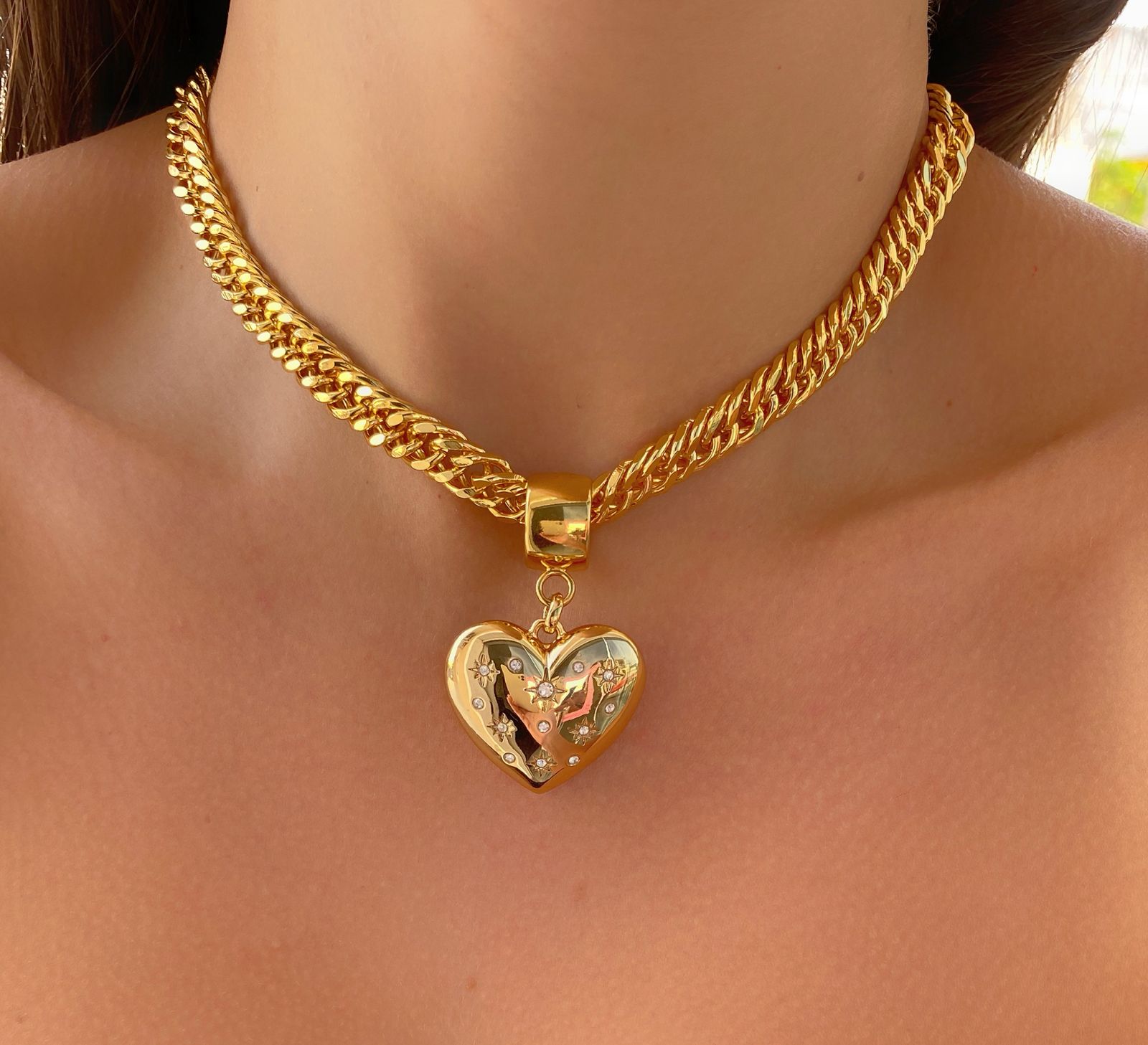 Colar corrente grumet  grossa + pingente coração  com pedras