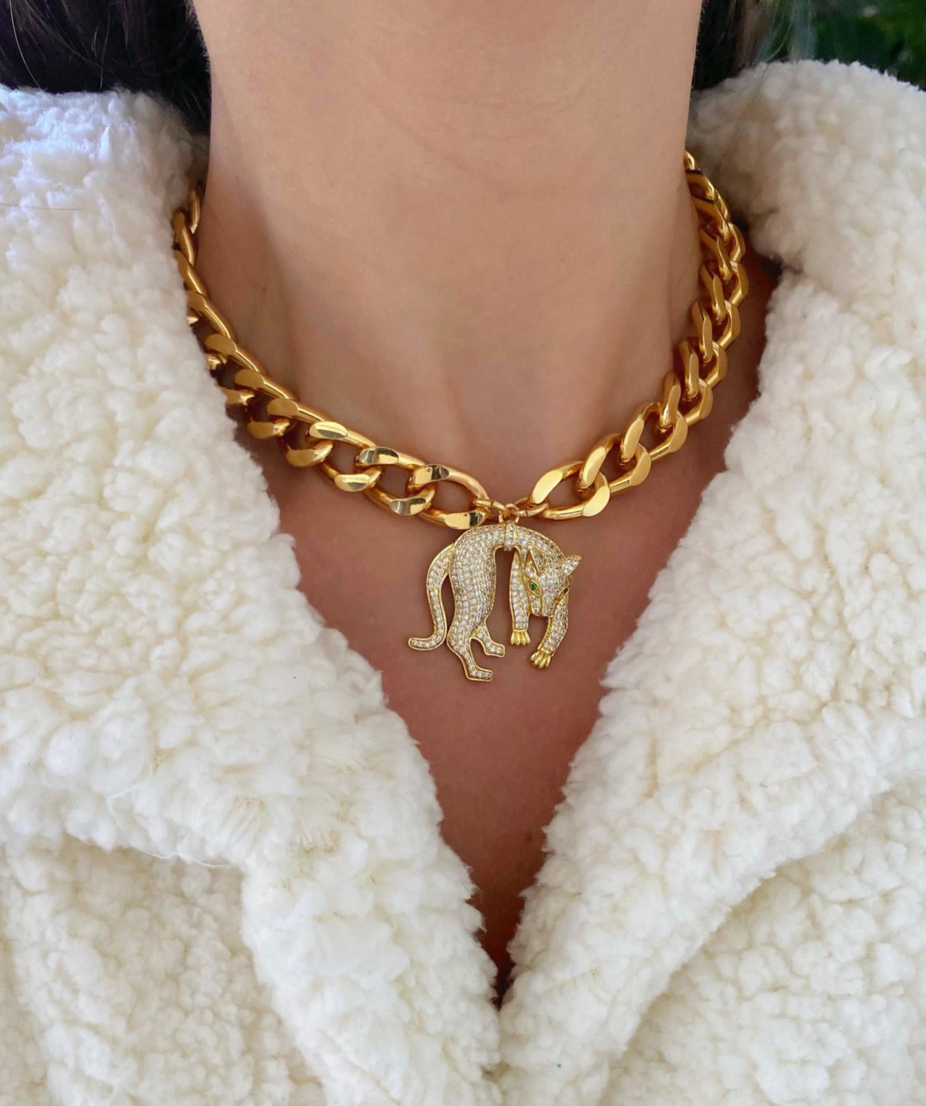 Colar corrente veneziana grossa + pingente pantera cravejado grande